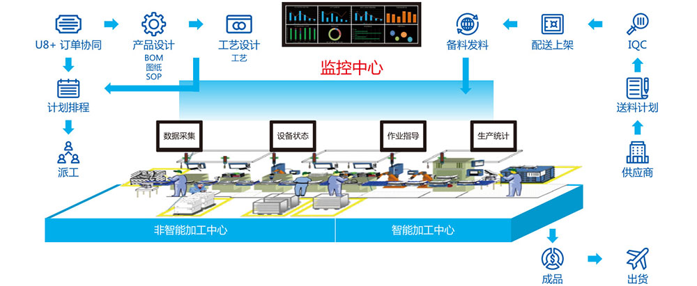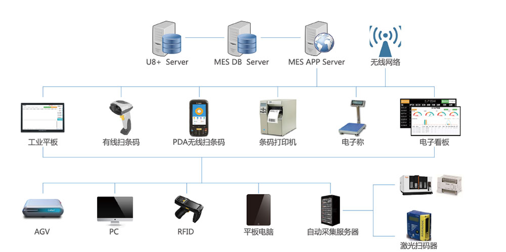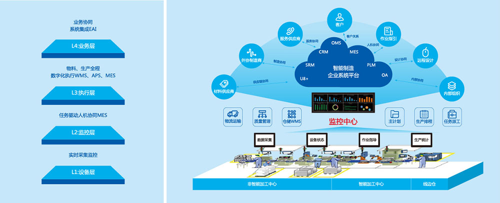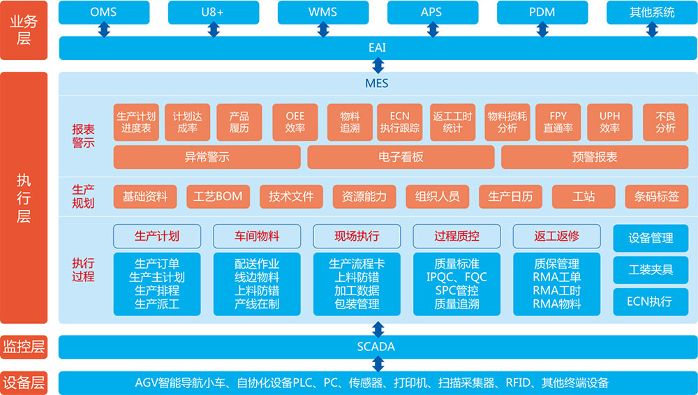 智能制造不但要生产自动化、信息化,更需跨业务层级整合信息系统,实现业务层、执行层、监控层、设备层的互联互通。MES系统是链接业务层与设备监控层的桥梁,通过MES可以实时掌控生产进度与监控异常。