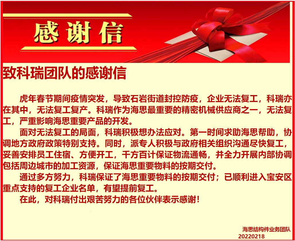 2月18日,杭州良盛电气有限公司技术精密加工事业部收到客户热情洋溢的感谢信,点名感谢团队5名成员。